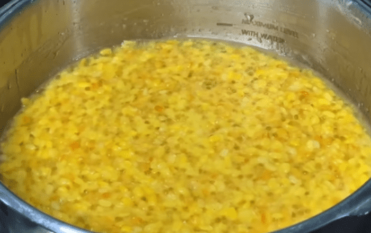 - அதில் சிறிதே சிறிது மட்டும் எண்ணெய் அல்லது நெய் சேர்த்துக் கொள்ளுங்க, [ இது பருப்பு எளிதாக, விரைவாக வெந்து வருவதற்கு உதவும்.]